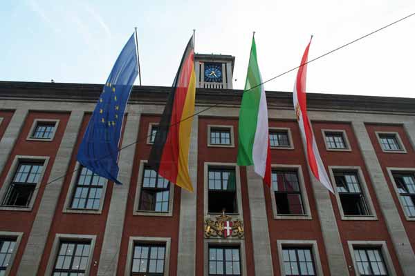 Das Neusser Rathaus hat sich dem Anlass entsprechend herausgeputzt. Am Turm befindet sich eine Ampel, die nur einmal im Jahr in Betrieb ist: Das weithin sichtbare rote Licht springt auf grün, sobald der Schützenzug unterwegs ist.